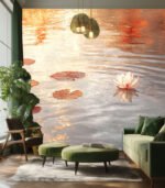 Serene pond with blooming lotus flowers and floating leaves, reflecting warm golden hues of sunset, creating a tranquil and picturesque scene.