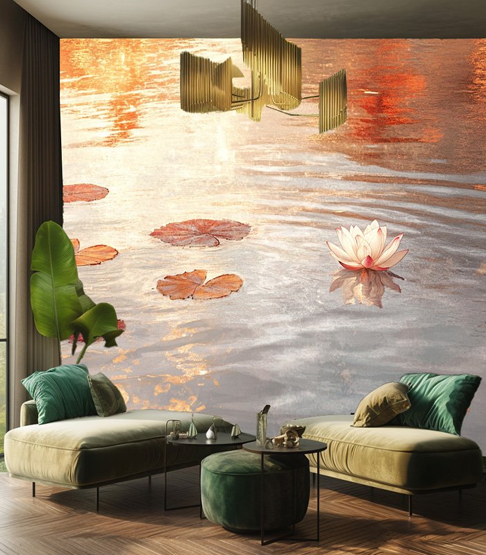 Serene pond with blooming lotus flowers and floating leaves, reflecting warm golden hues of sunset, creating a tranquil and picturesque scene.
