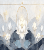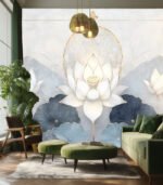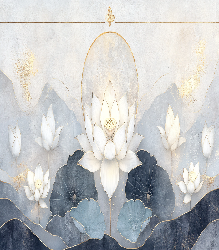 Elegant lotus flowers bloom against a serene backdrop, with delicate gold accents and soft hues, creating a tranquil and harmonious atmosphere.