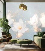 Delicate white lotus flowers with golden accents float gracefully on a serene blue background, creating a tranquil and ethereal atmosphere.