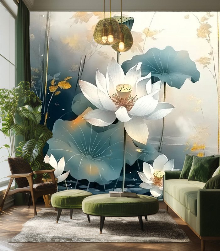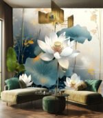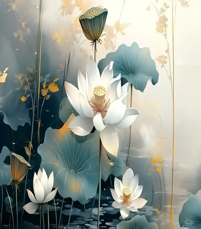 Serene digital artwork of white lotus flowers and leaves, with golden accents, creating a tranquil and ethereal atmosphere in a misty setting.