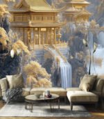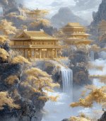 A fantastical golden landscape featuring traditional Asian architecture nestled among towering cliffs and cascading waterfalls, evoking a serene and majestic otherworldly realm.
