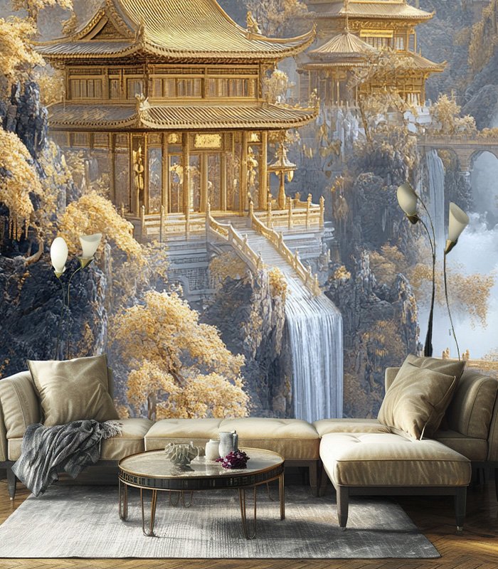 A fantastical golden landscape featuring traditional Asian architecture nestled among towering cliffs and cascading waterfalls, evoking a serene and majestic otherworldly realm.