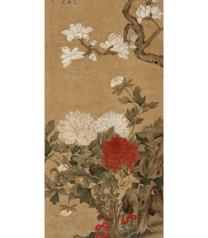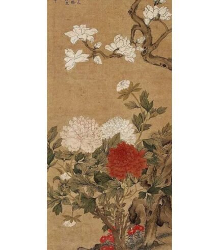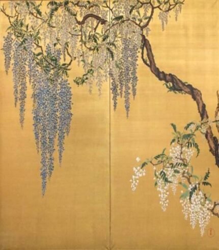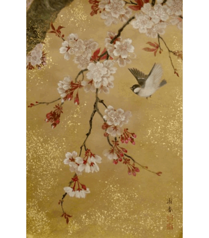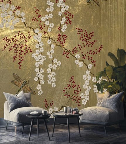 Delicate cherry blossoms and dragonflies on a golden background, blending traditional Japanese art with nature’s elegance and tranquility.