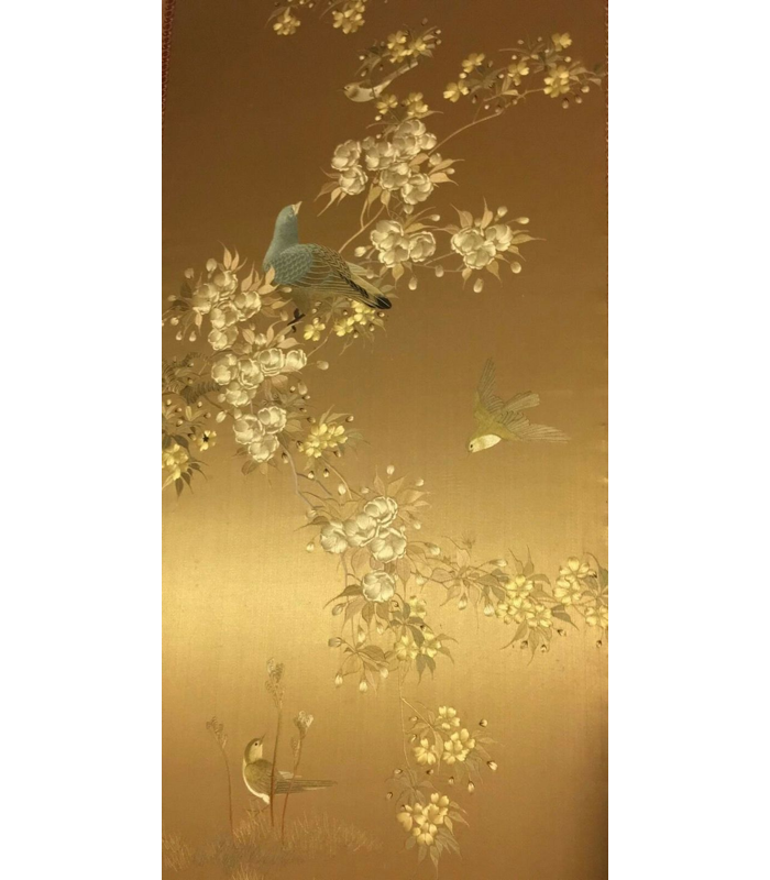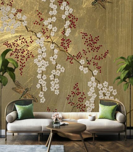 Delicate cherry blossoms and dragonflies on a golden background, blending traditional Japanese art with nature’s elegance and tranquility.