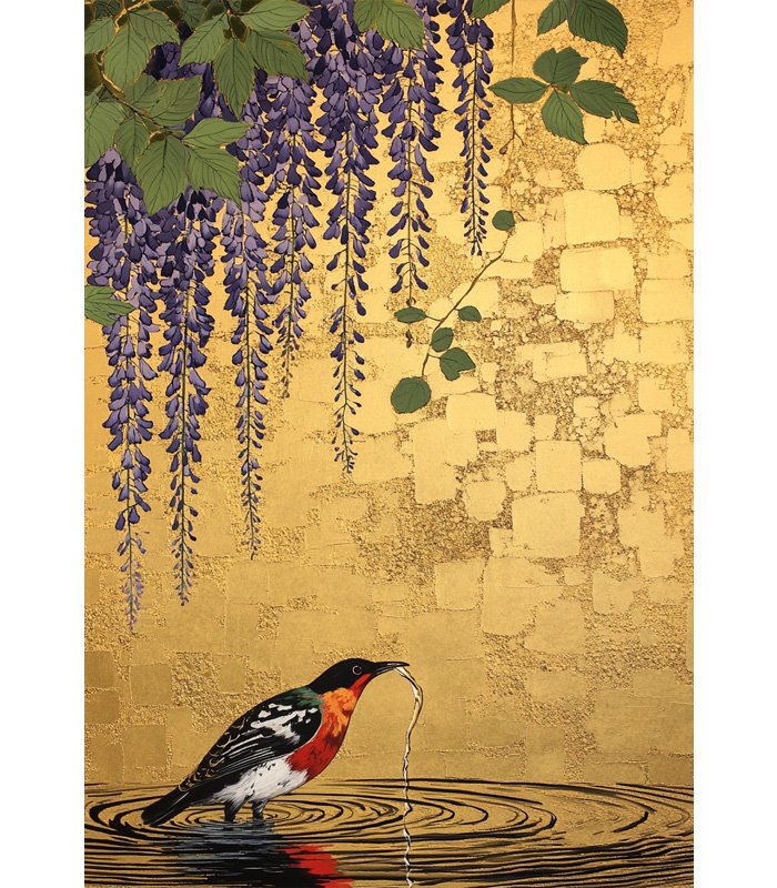 A vibrant bird stands in rippling water beneath cascading purple flowers, set against a textured golden background, creating a serene and elegant scene.