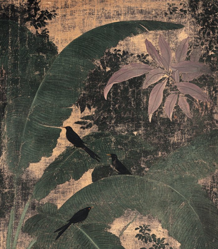 Vibrant birds soar above a lush, misty forest landscape, depicted on a textured golden background, evoking a serene, timeless atmosphere in traditional Eastern art style.