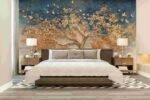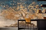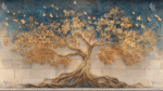 A large, artistic tree with golden leaves and roots, set against a blue and textured wall, with small birds flying around.