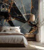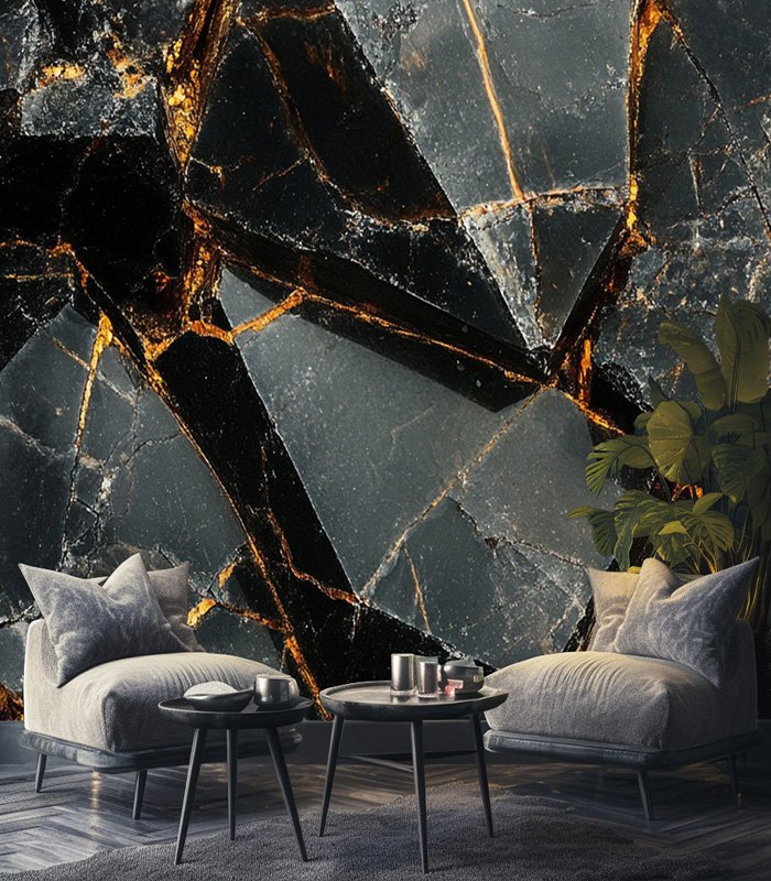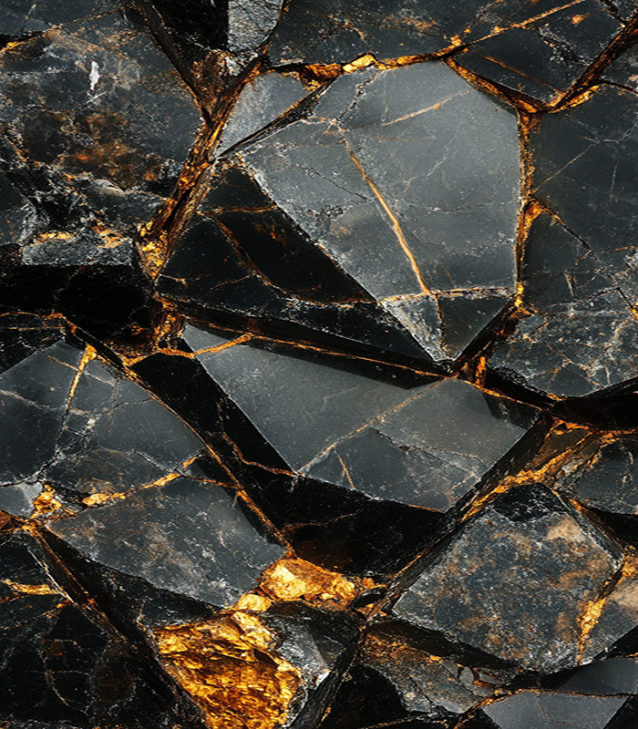 Close-up of a luxurious black marble surface with intricate golden veins, showcasing a natural pattern of elegance and rugged beauty.