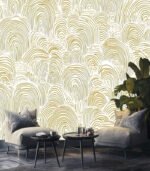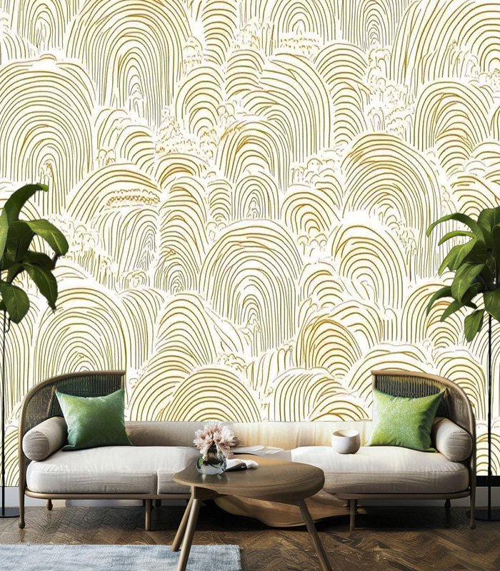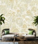 Abstract pattern of golden, swirling lines creating a textured, wave-like design. The intricate curves form a harmonious and elegant visual rhythm.