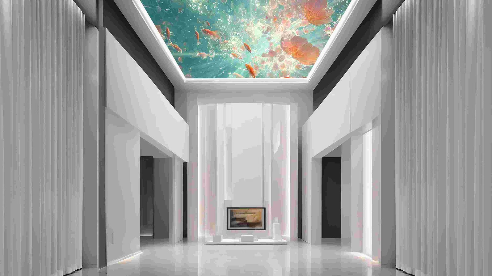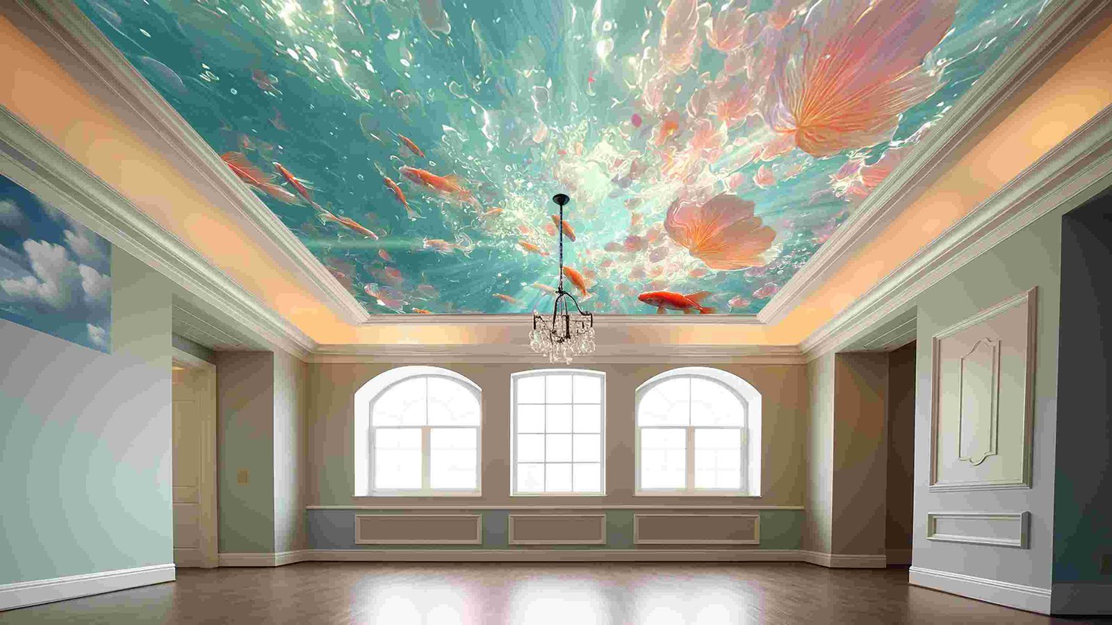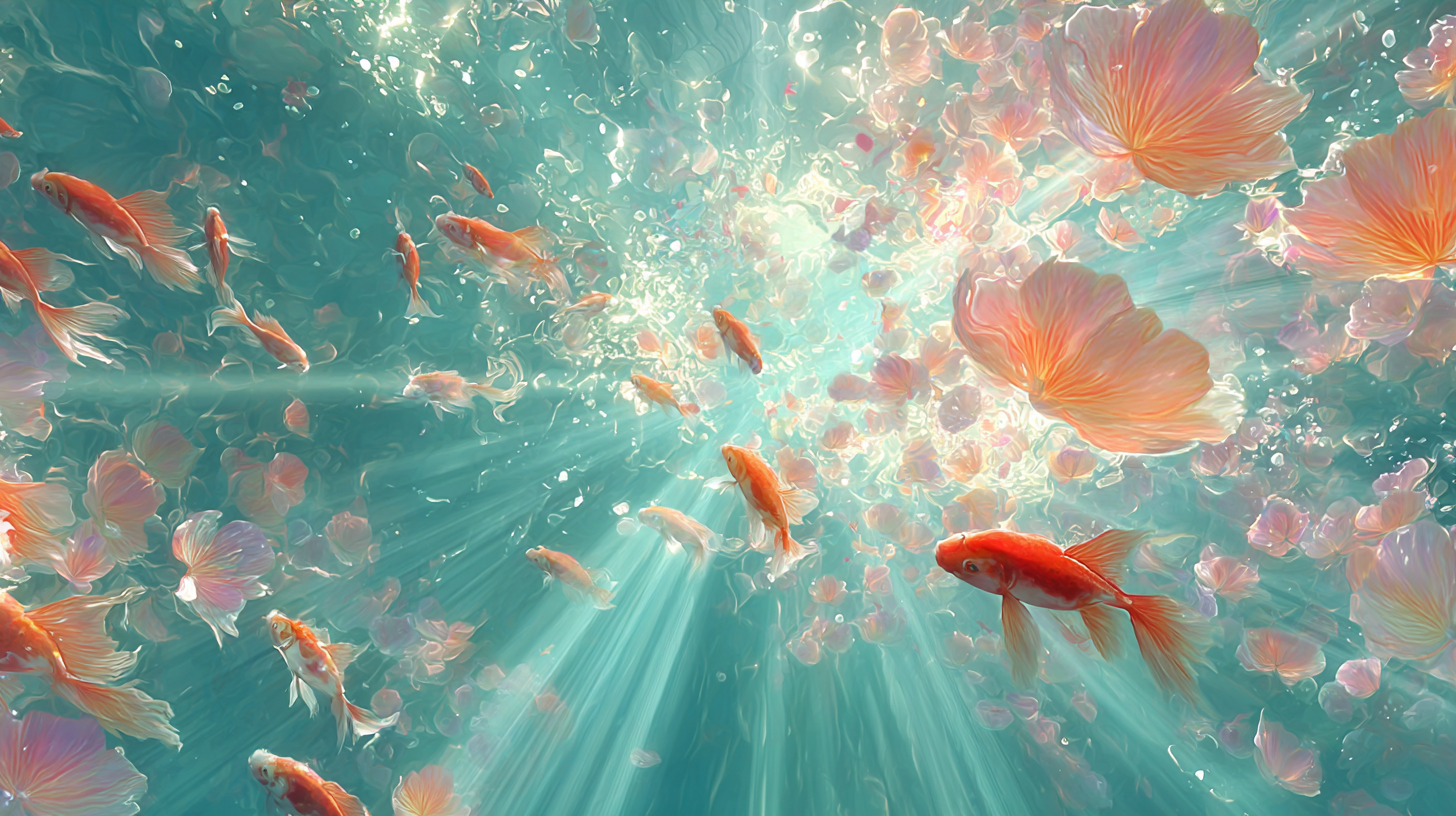 A scene with multiple goldfish swimming among colorful petals and beams of light in a blue underwater environment.