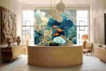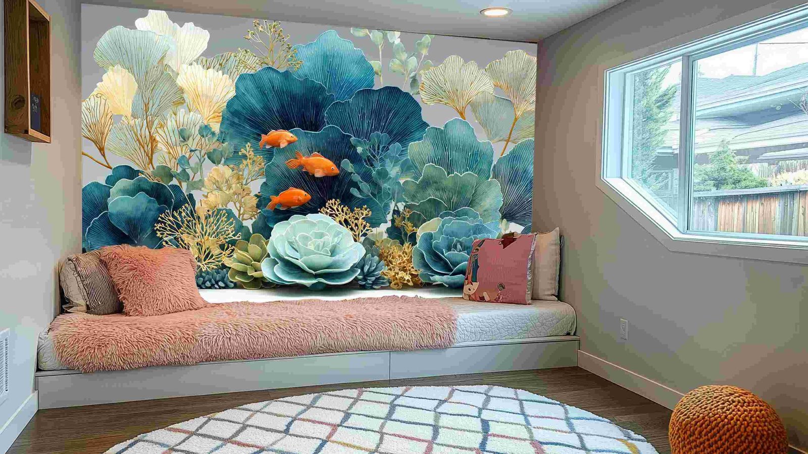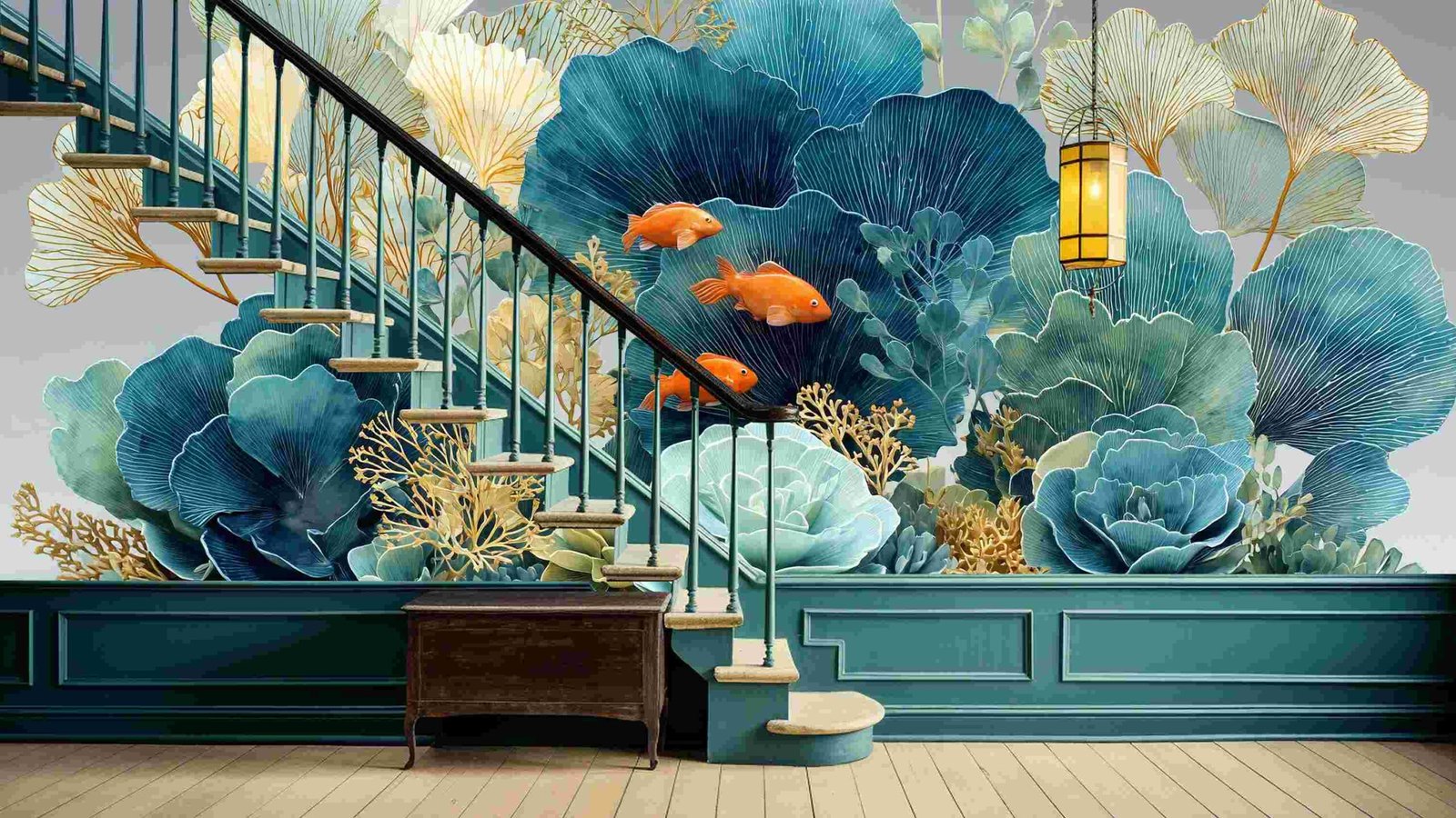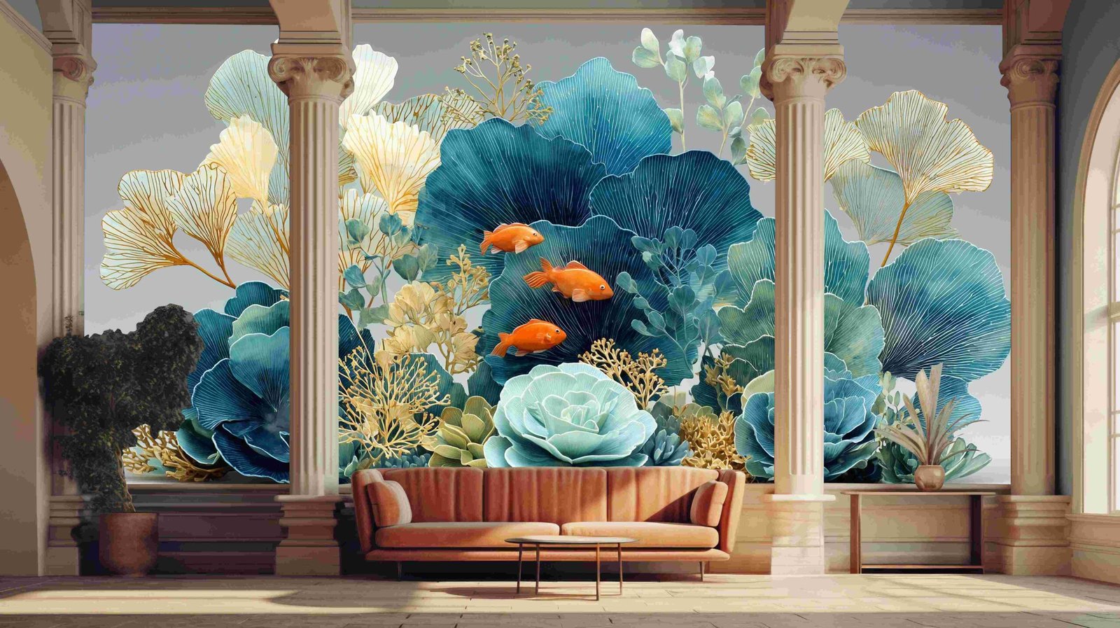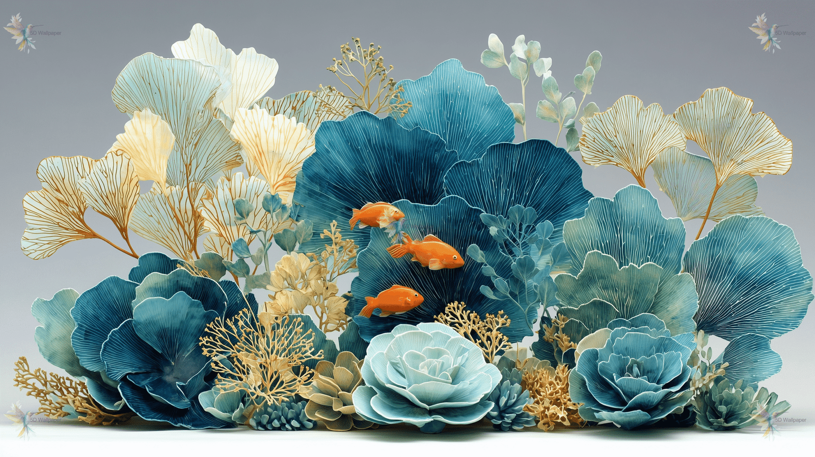 Three vibrant orange goldfish swim among intricate teal and green foliage.