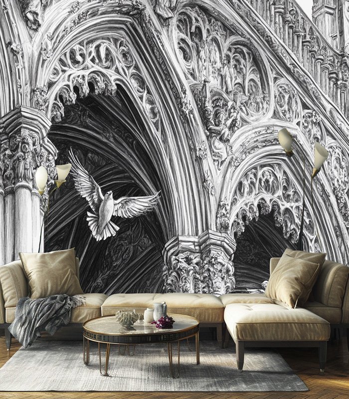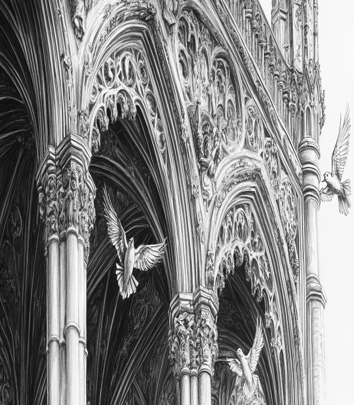 Intricate Gothic architecture with soaring doves, showcasing detailed arches and columns, blending nature and artistry in a harmonious black and white composition.
