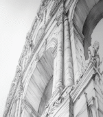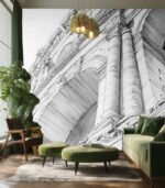Majestic stone steps lead to towering columns, evoking a sense of grandeur and timeless architectural elegance against a serene, cloudy sky backdrop.