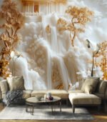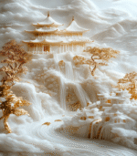 A stunning, ethereal depiction of a traditional Asian palace amidst cascading waterfalls and clouds, crafted in white and gold, evoking a serene, heavenly ambiance.