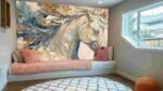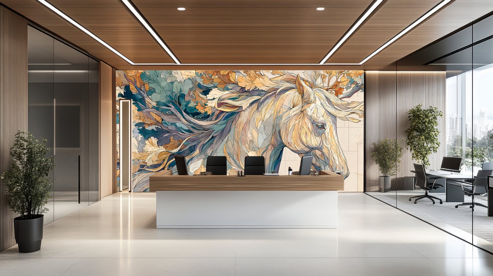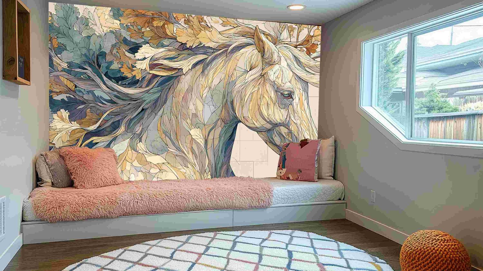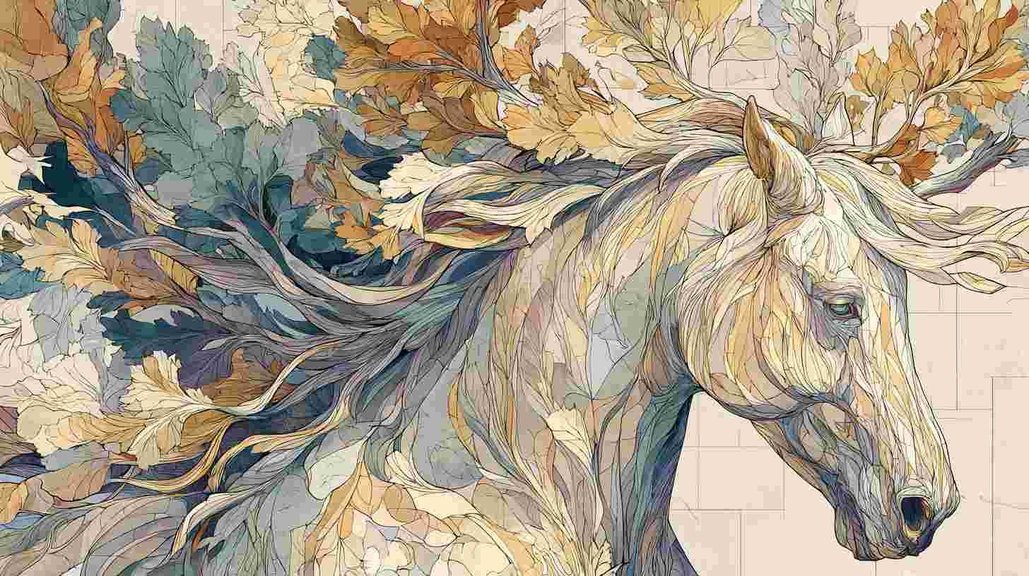 A stylized horse head adorned with colorful autumn leaves and flowing mane, featuring intricate patterns and soft colors.