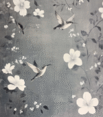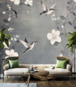 Hummingbirds gracefully hover among delicate white flowers on a textured gray background, creating a serene and elegant nature-inspired scene.