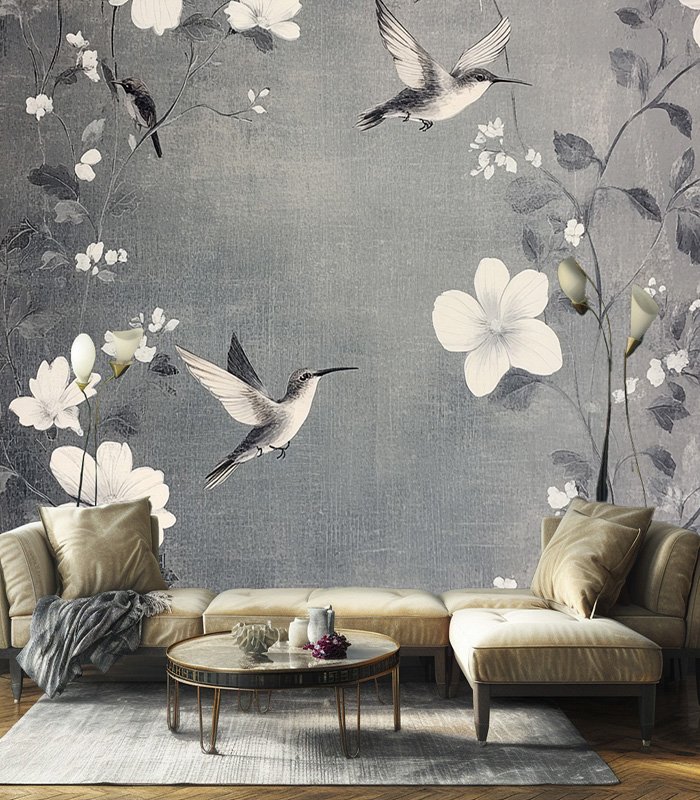 Hummingbirds gracefully hover among delicate white flowers on a textured gray background, creating a serene and elegant nature-inspired scene.