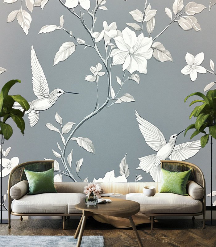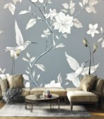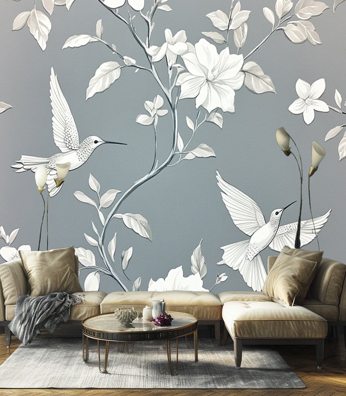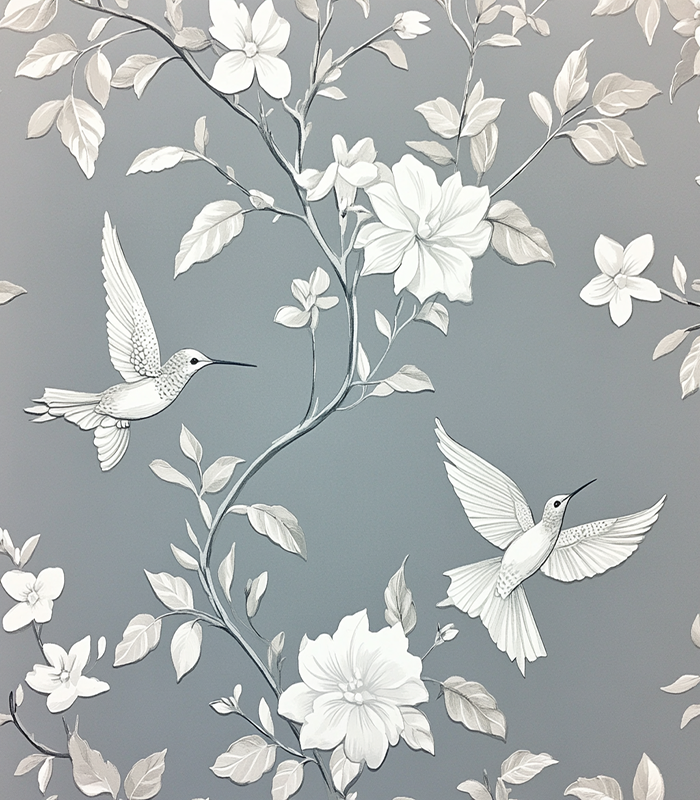 Delicate hummingbirds gracefully hover among blooming flowers and leaves, creating an elegant and serene monochrome pattern on a soft gray background.