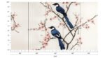 Two deep blue-and-white birds with bright red eyes perch quietly among pale pink cherry blossoms against a soft ivory canvas.