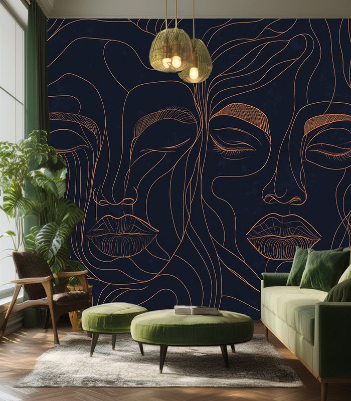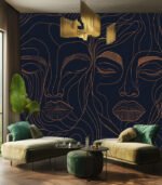 Abstract line art of two faces intertwined, featuring flowing lines and closed eyes, set against a dark background, creating a serene, artistic expression.