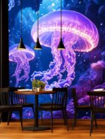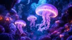 Three glowing jellyfish float in a vibrant underwater scene surrounded by colorful coral and bubbles.