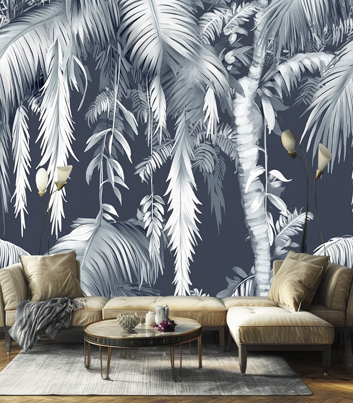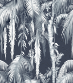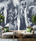 Monochrome illustration of lush tropical foliage, featuring detailed palm leaves and ferns, creating a serene and exotic jungle atmosphere against a dark background.