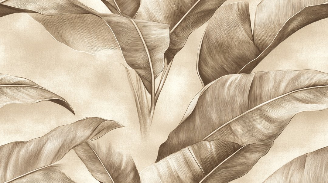 A decorative design featuring large, stylized leaves in shades of brown on a light background.
