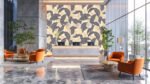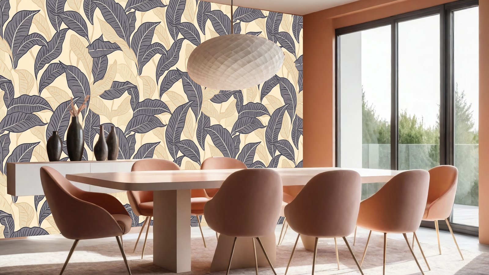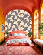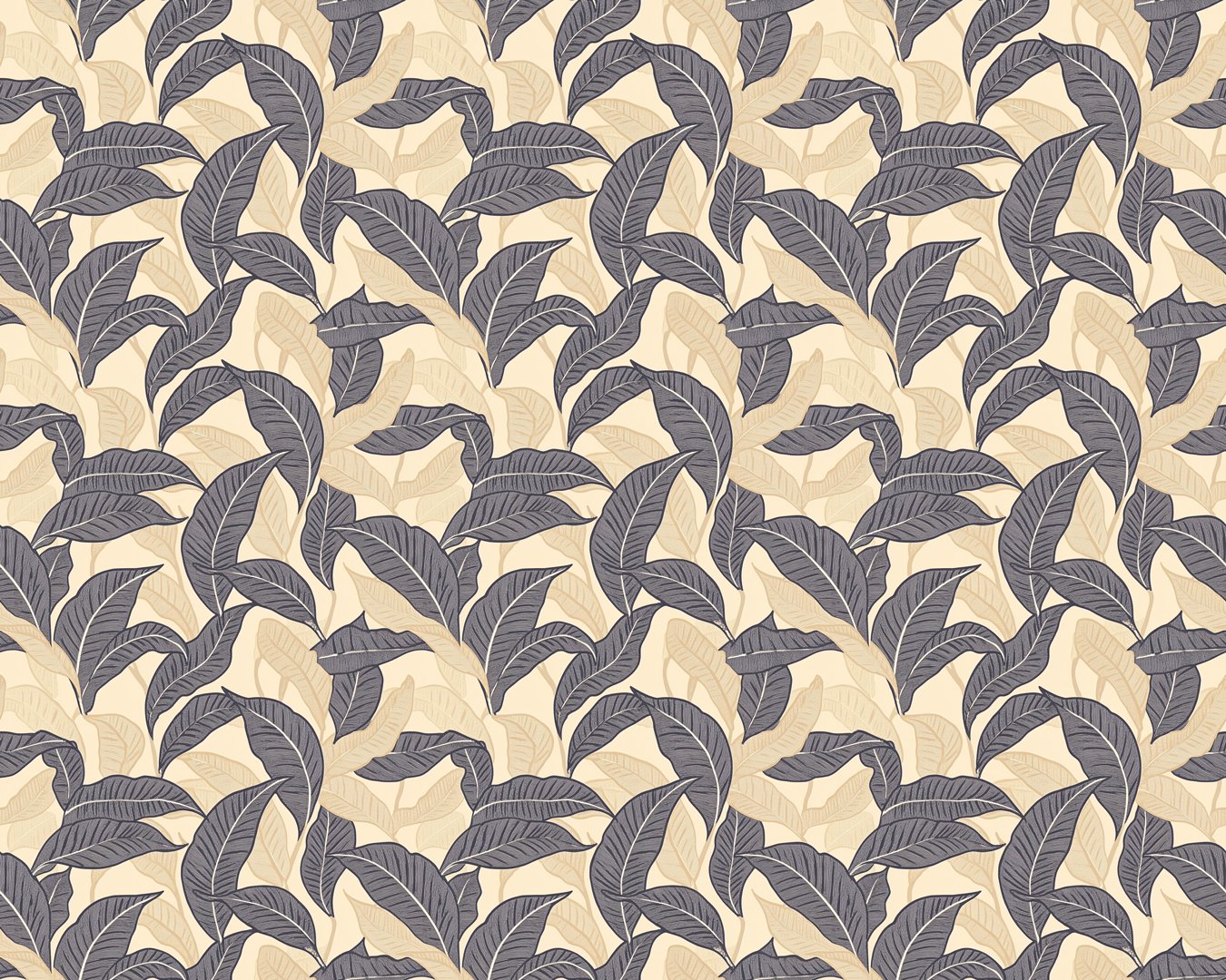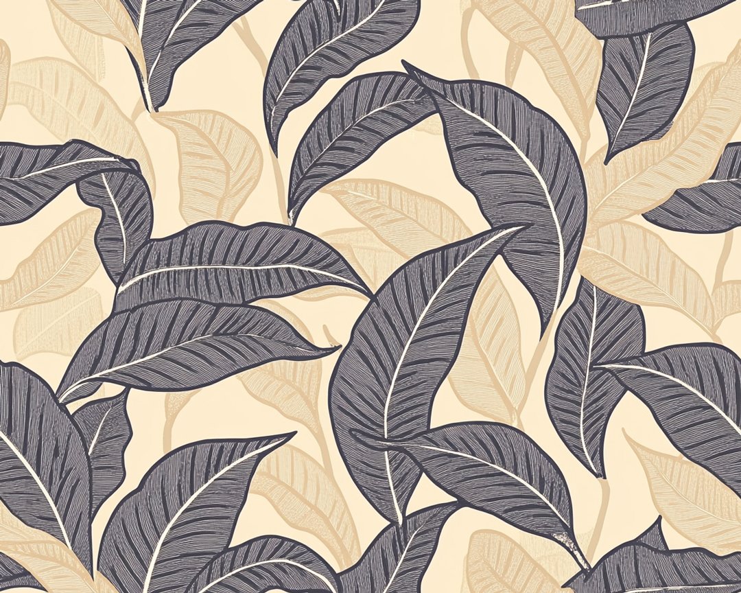 A decorative design featuring various leaves in dark and light shades on a beige background.
