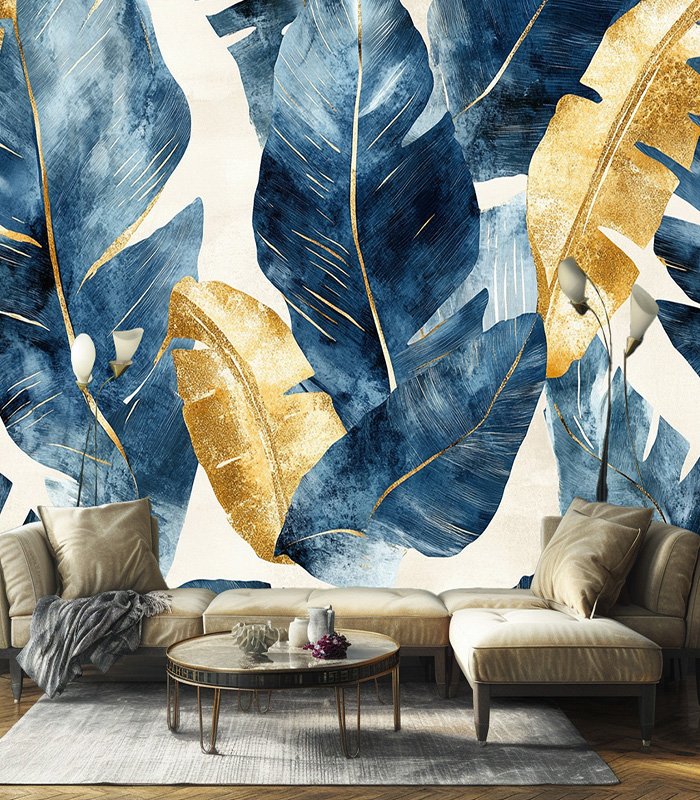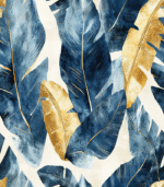 Abstract artwork featuring large, textured leaves in shades of blue and gold, creating a vibrant and dynamic pattern against a light background.