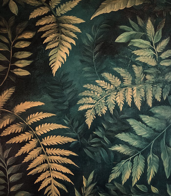 A lush, textured painting of various green and golden leaves, creating a dense, layered botanical scene with a deep, moody background.