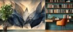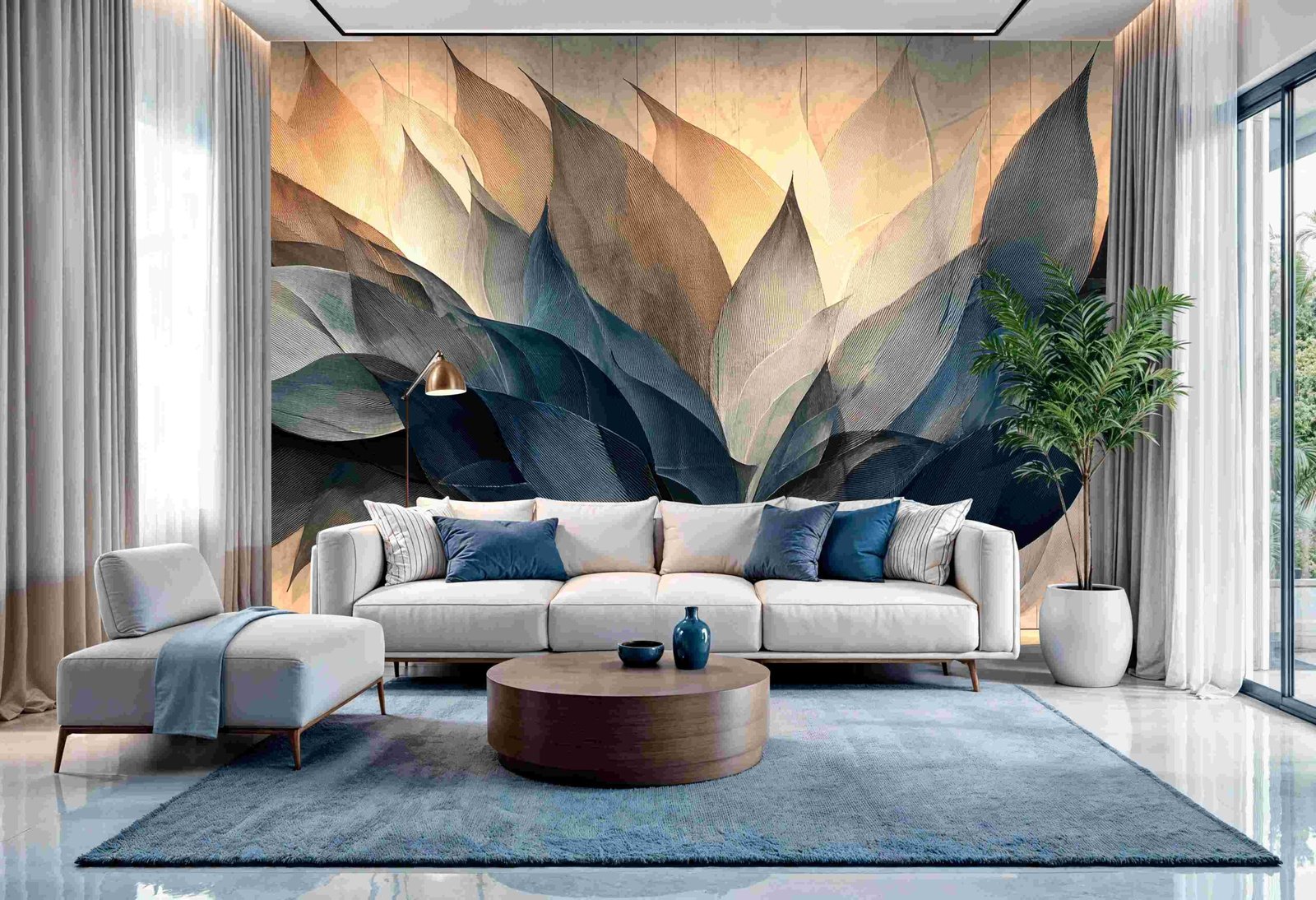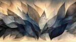 A decorative arrangement of large, layered leaves in various shades of blue and beige.