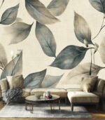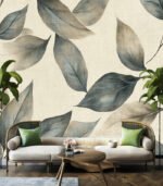 Elegant botanical pattern featuring soft, muted leaves on a textured beige background, creating a serene and sophisticated natural design for decor or textiles.