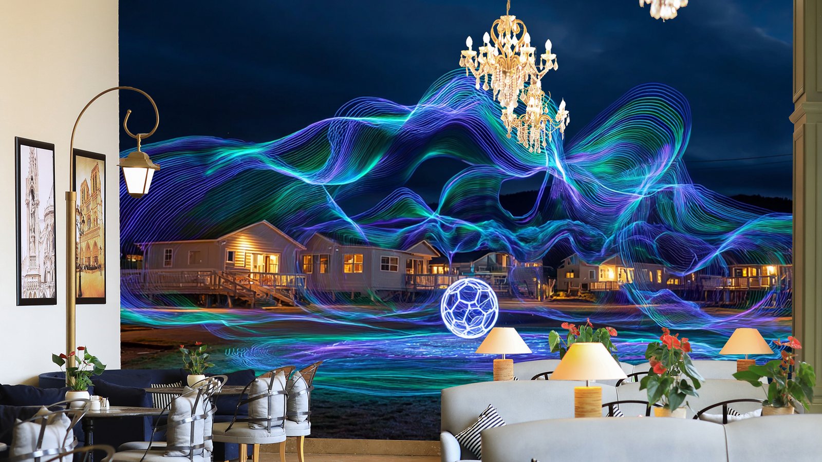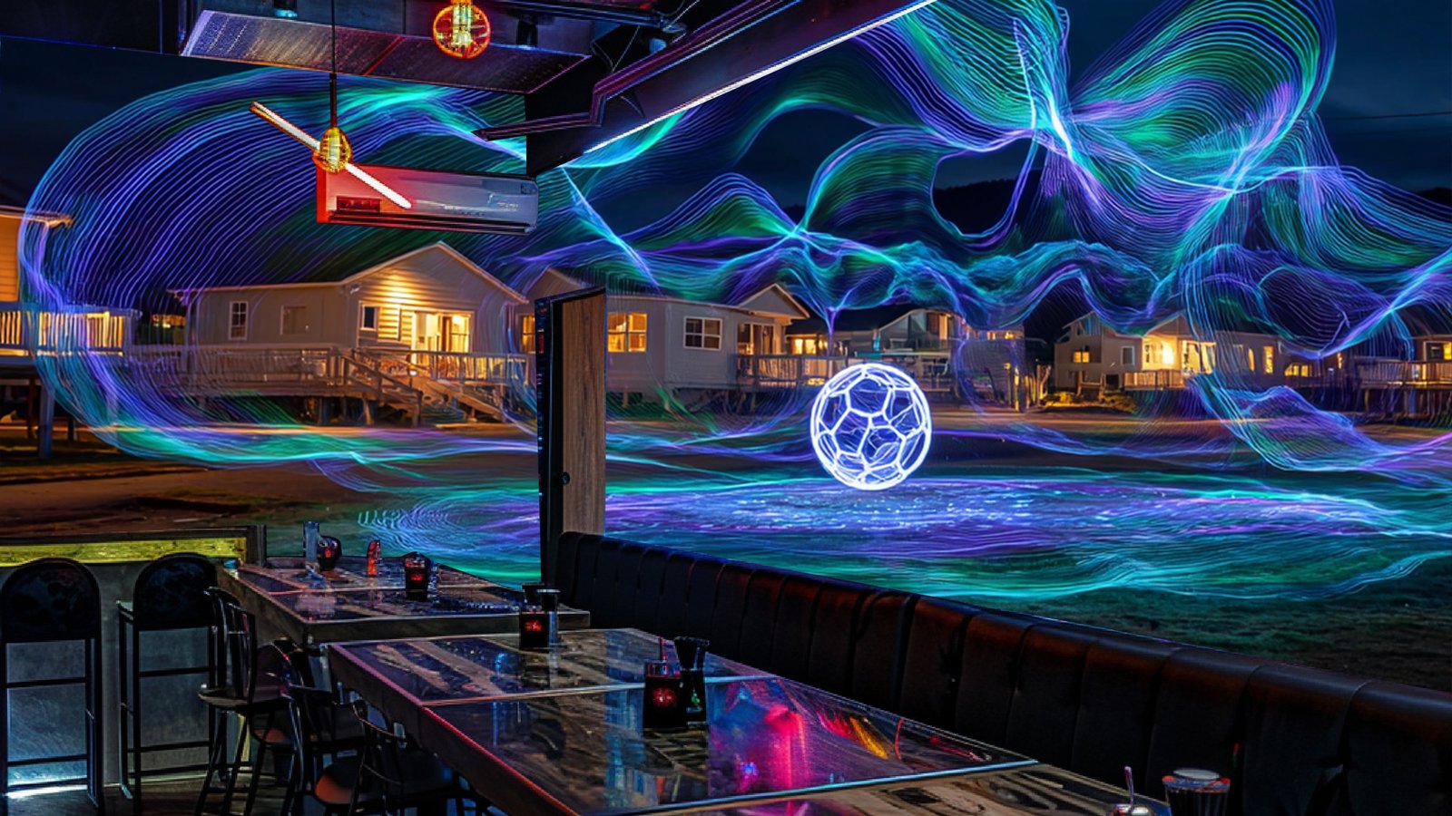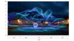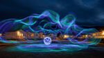 Colorful light trails create a dynamic visual effect around a glowing sphere near illuminated buildings