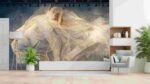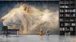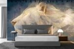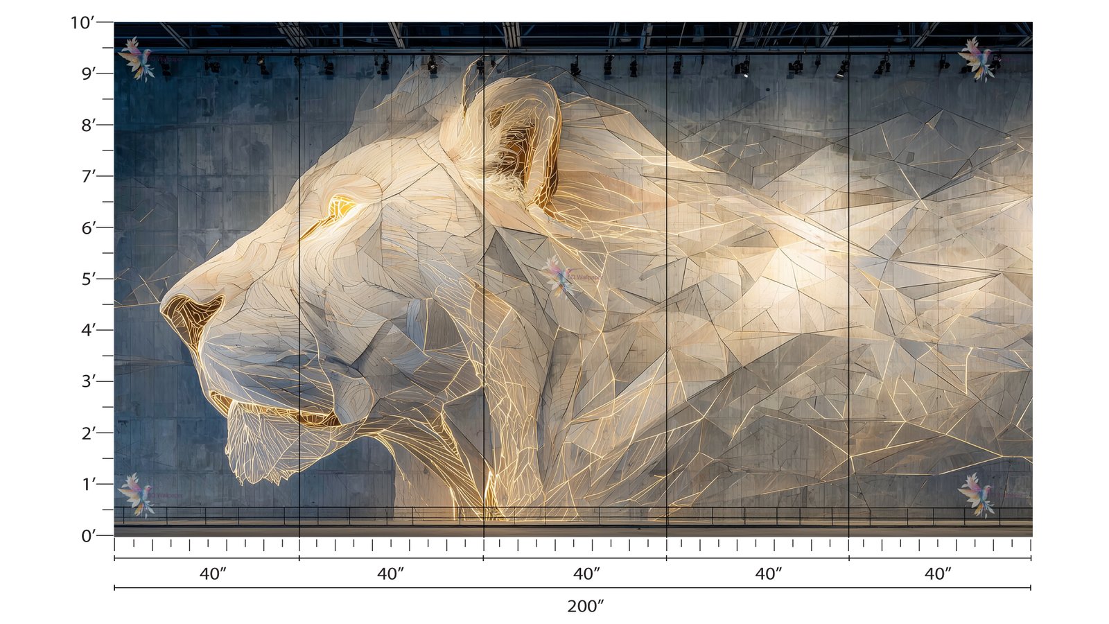 A large geometric sculpture of a lion’s head, featuring intricate lines and a metallic finish.