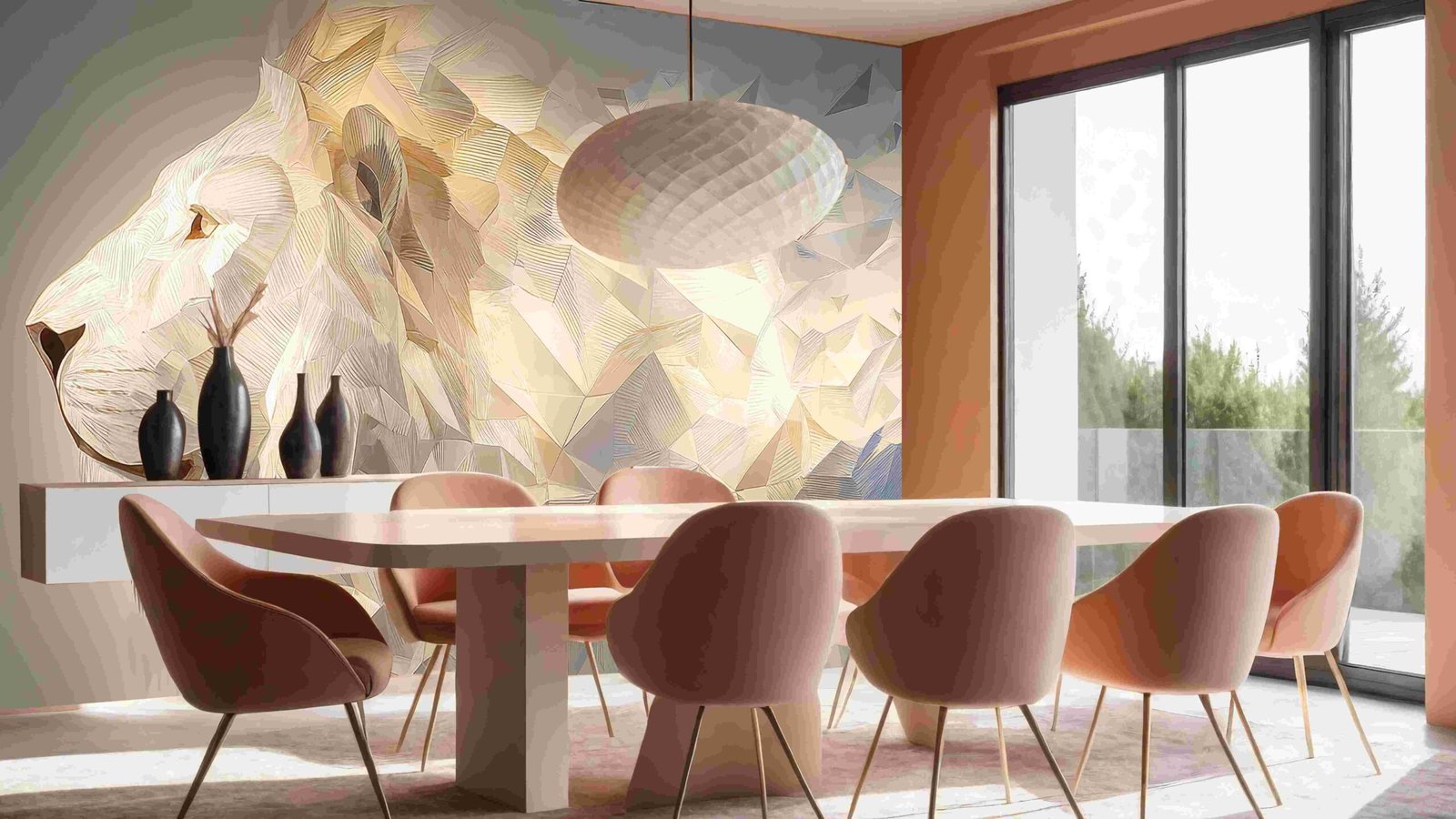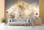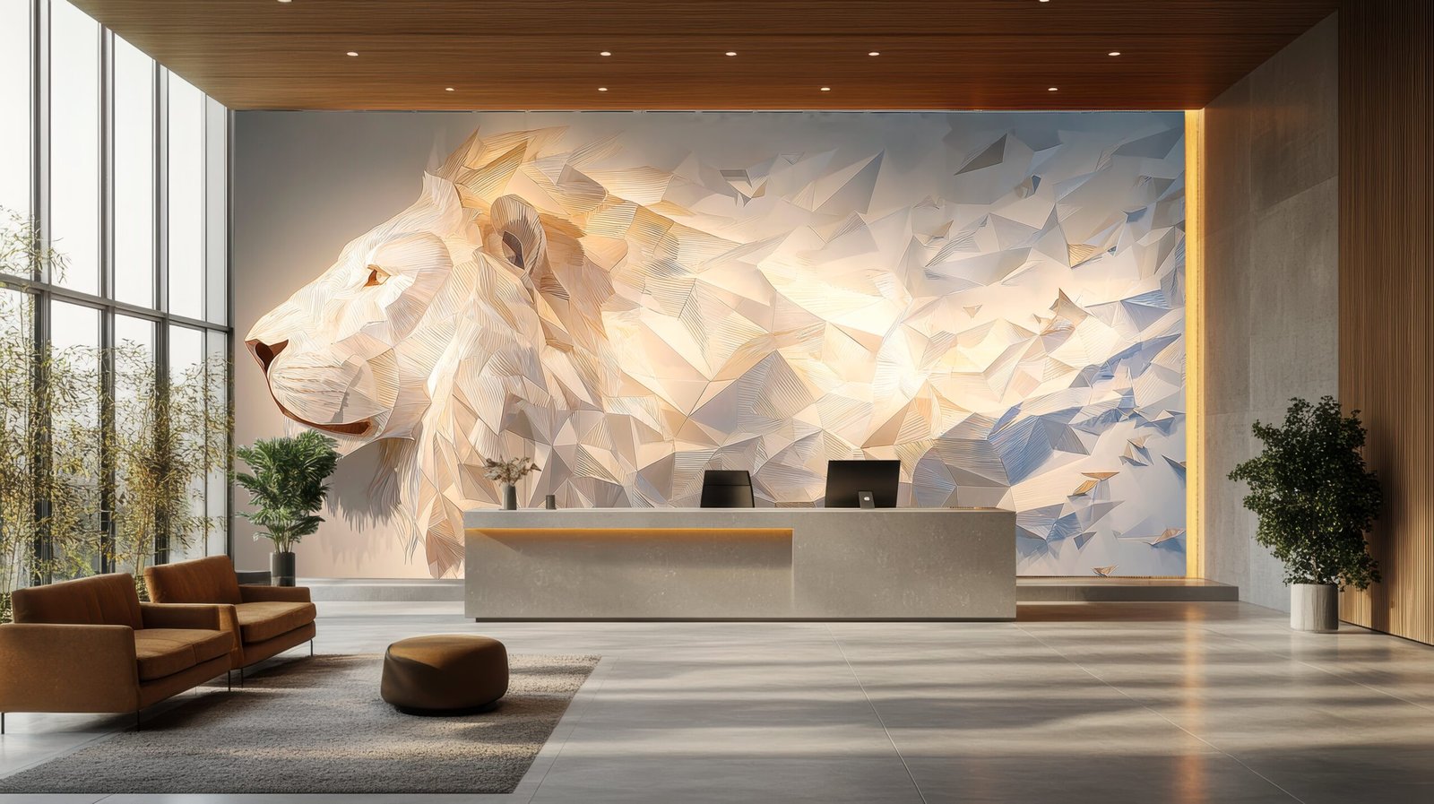 Geometric lion sculpture on a wall, made of angular, layered materials with a textured appearance.