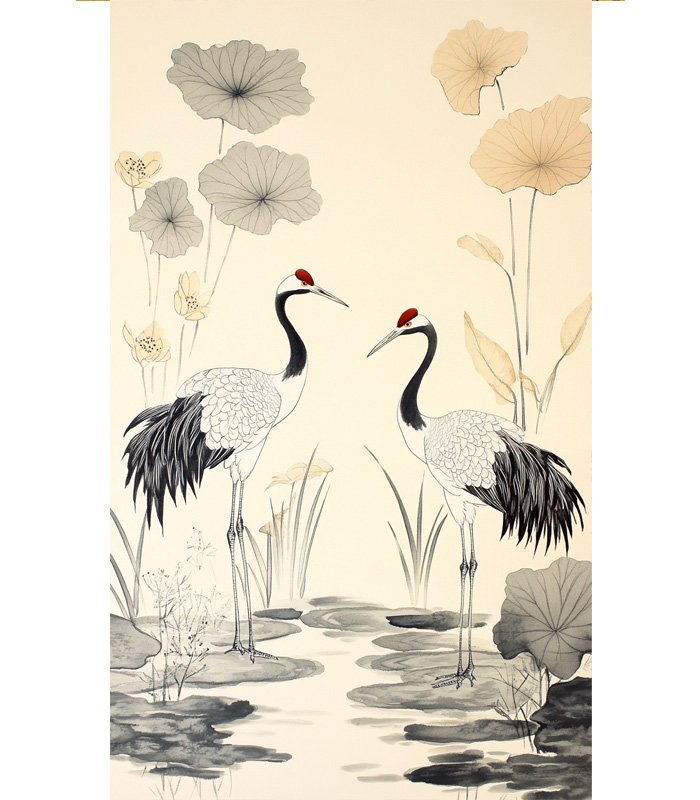 Two elegant cranes stand gracefully in a serene pond, surrounded by delicate lotus flowers and leaves, creating a tranquil and harmonious scene.