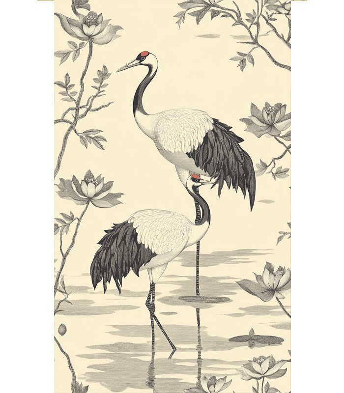 Two elegant cranes stand gracefully in a serene pond, surrounded by blooming lotus flowers and delicate branches, creating a tranquil, nature-inspired scene.