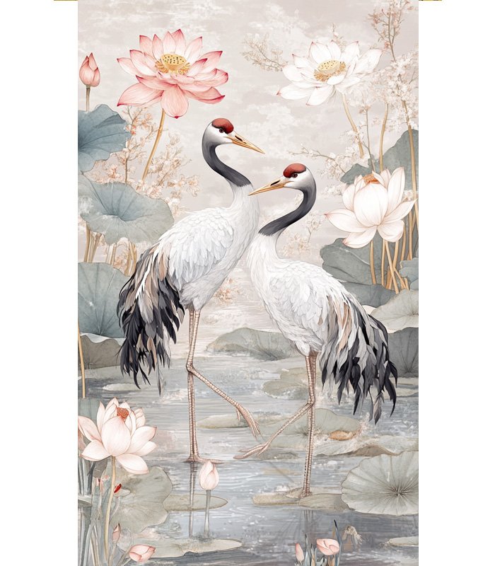 Two elegant cranes stand gracefully in a serene pond, surrounded by blooming lotus flowers, creating a tranquil and harmonious natural scene.
