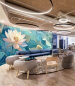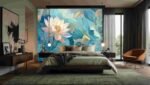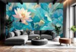 A pink lotus flower surrounded by large blue-green leaves and buds in a serene aquatic setting.