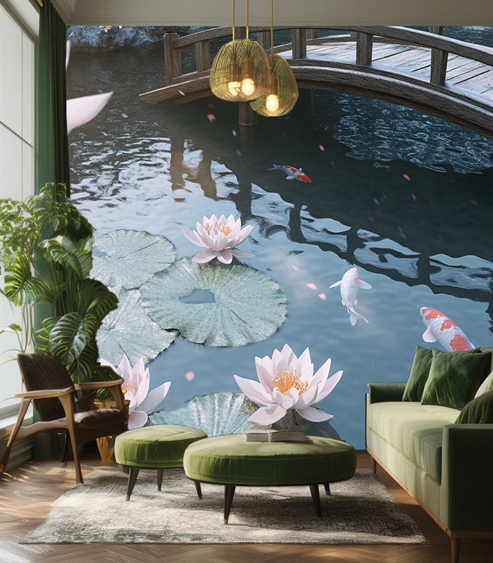 Serene pond with blooming lotus flowers, colorful koi fish, and a rustic wooden bridge, creating a tranquil and picturesque garden scene.