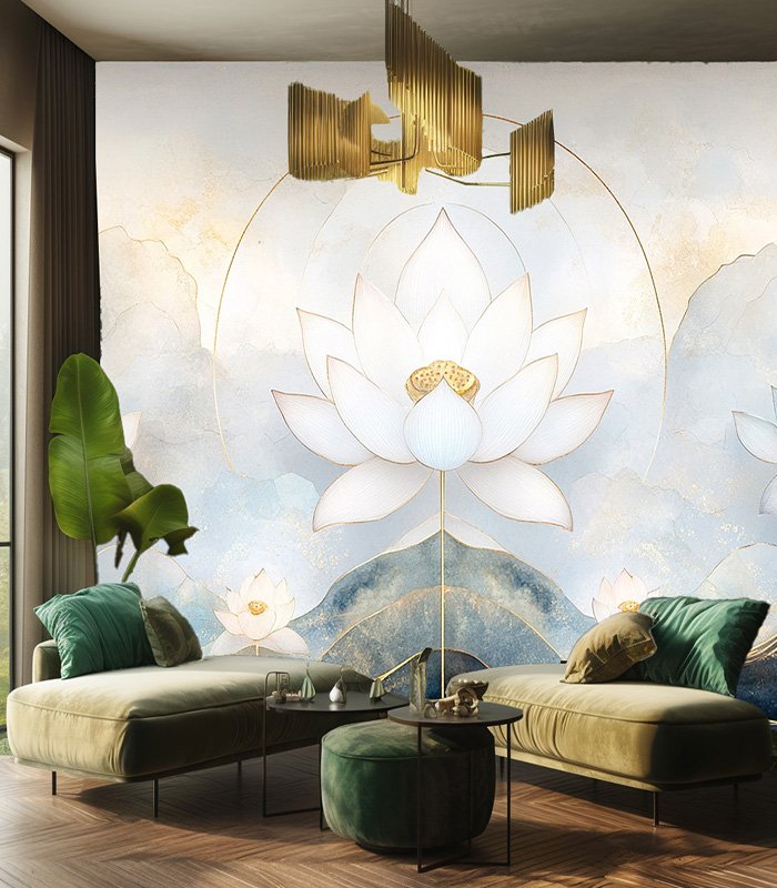 Elegant lotus flowers bloom amidst serene, abstract mountains, blending soft blues and golds in a harmonious, ethereal landscape.