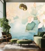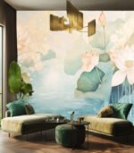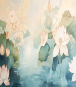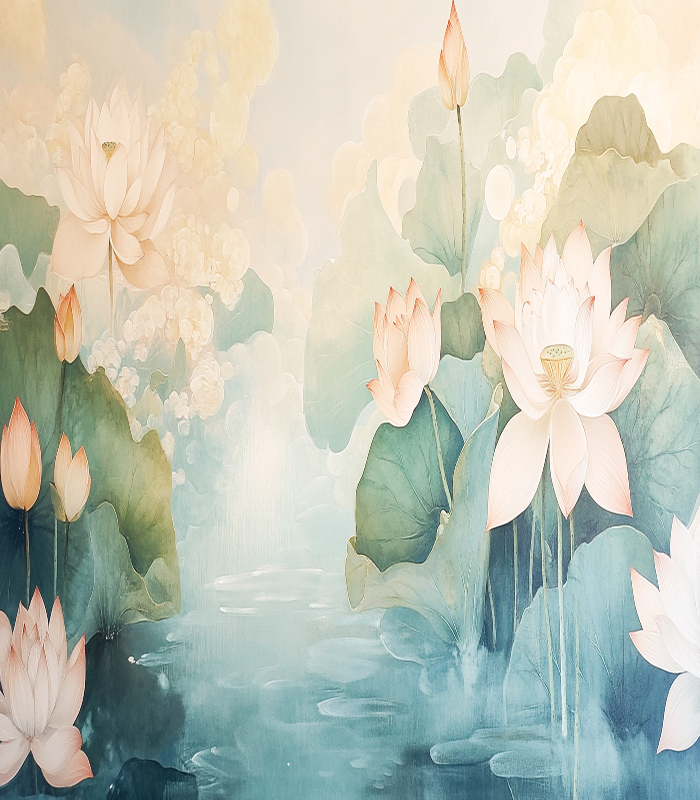 Serene watercolor painting of blooming lotus flowers and lush green leaves, creating a tranquil and ethereal atmosphere over a calm, reflective pond.
