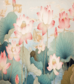 Delicate pink lotus flowers bloom gracefully amidst lush green leaves, creating a serene and tranquil scene reminiscent of traditional Asian art.