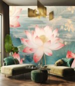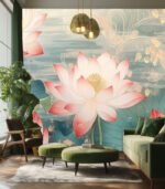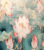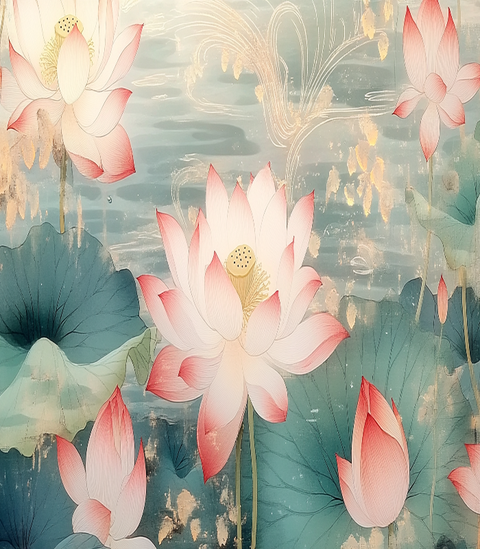 Delicate lotus flowers bloom gracefully on a serene water surface, surrounded by lush green leaves and subtle golden accents, creating a tranquil scene.