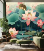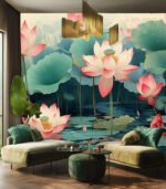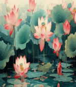 Serene lotus blossoms float gracefully on tranquil water, surrounded by lush green leaves, creating a peaceful and harmonious natural scene.
