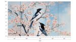 Two magpies perched on a branch surrounded by pink cherry blossoms against a blue background
