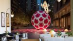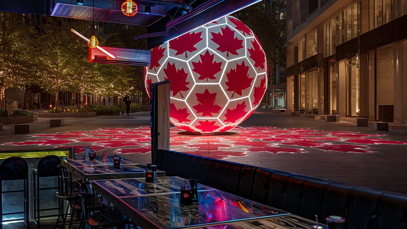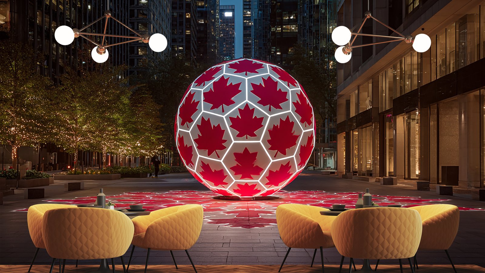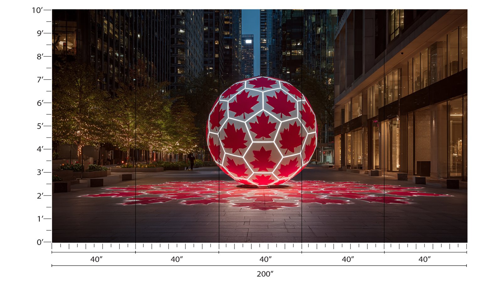 Illuminated sphere featuring red maple leaf patterns in an urban setting at night