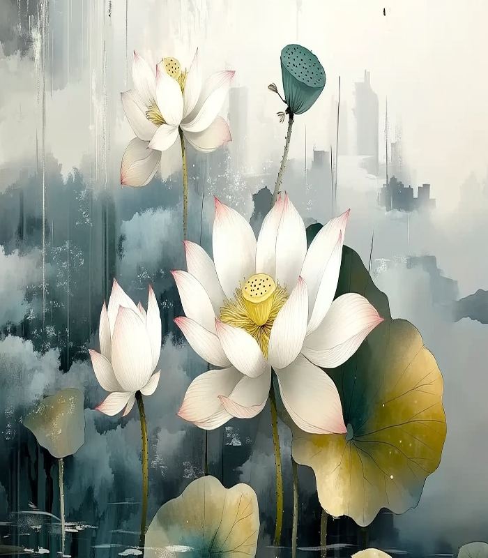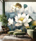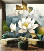 Elegant lotus flowers bloom amidst a serene, misty landscape, blending nature’s beauty with artistic brushstrokes in a tranquil, dreamlike setting.