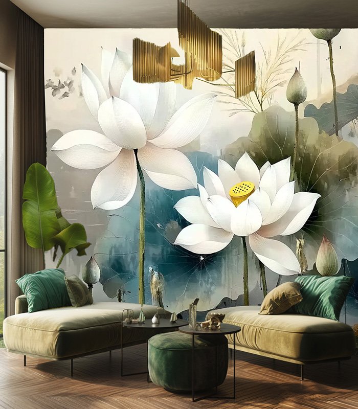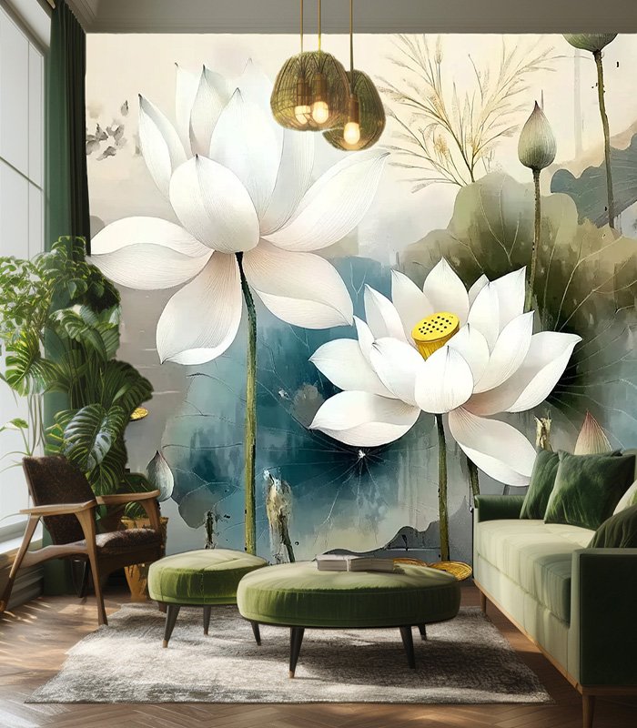 Serene watercolor painting of white lotus flowers and buds, surrounded by lily pads, set against a tranquil, misty background.